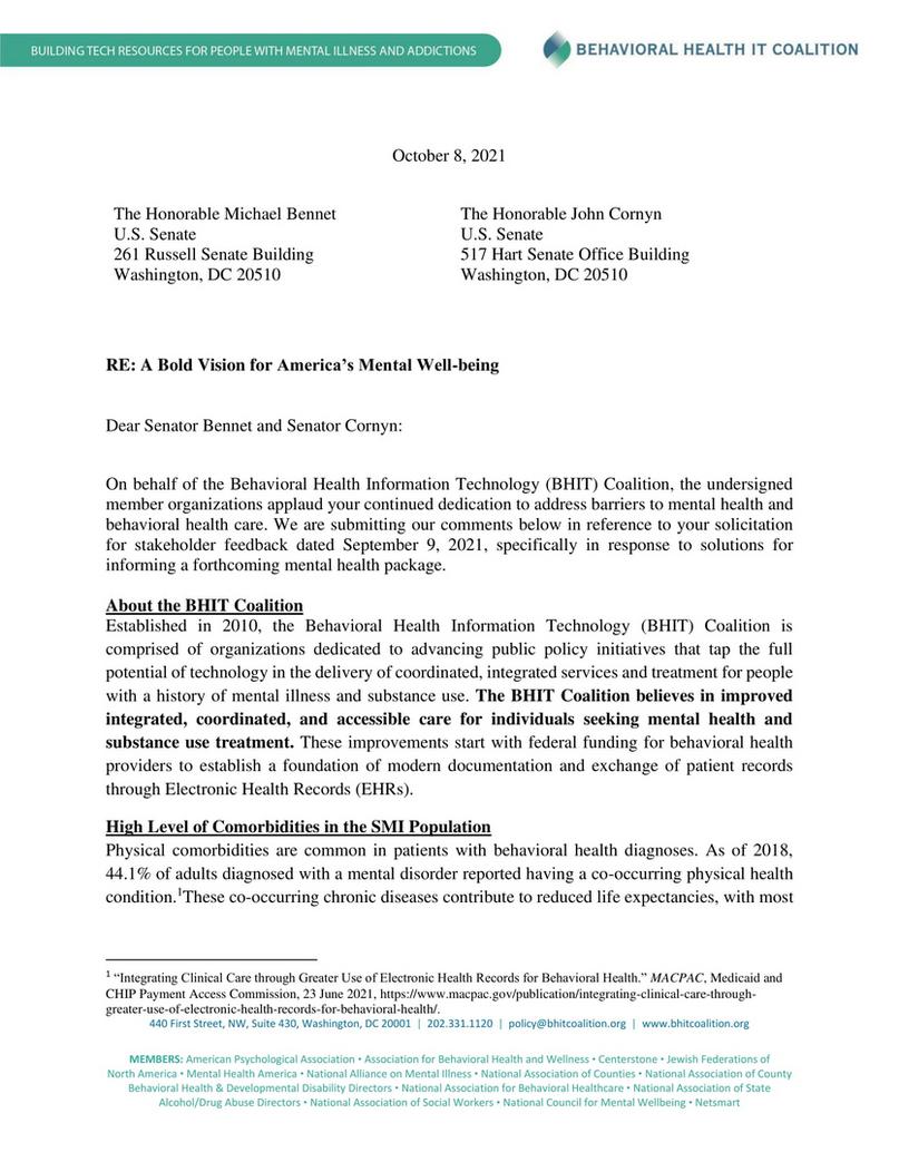BHIT Coalition submits letter responding to Sen. Bennett and Sen. Cornyn Request for Information on innovative mental health actions.