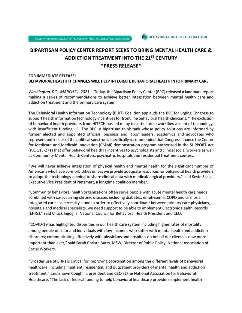 Bipartisan Policy Center releases report recommending integration of behavioral health information technologies.