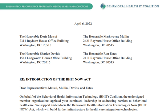 BHIT Coalition commends Representatives Doris Matsui and Markwayne Mullin for their introduction of the BHIT NOW Act.